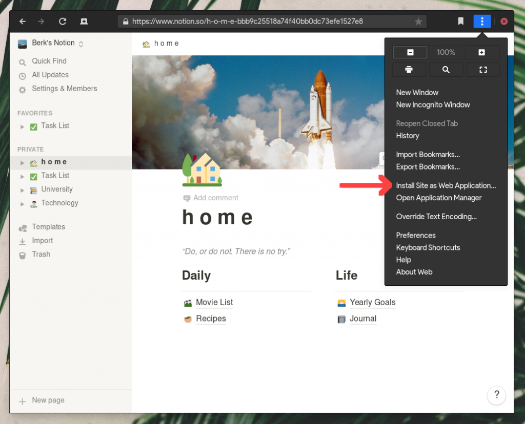 Basically, open the browser and go to notion.so and login. Once done, open the menu (top-right) and click on “Install Site as Web Application”.